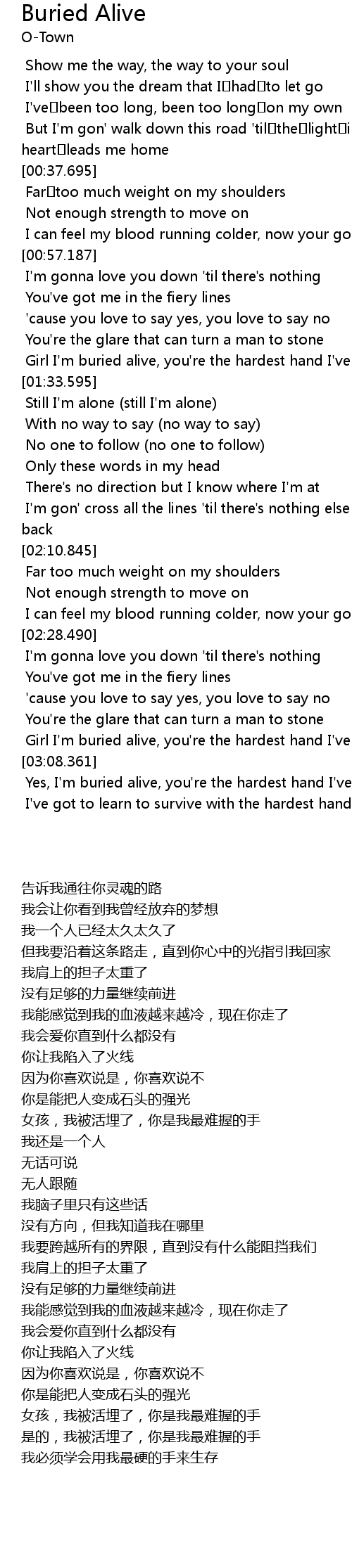 | [03:01.255] | Girl I'm buried alive, you're the hardest hand I've had to hold |