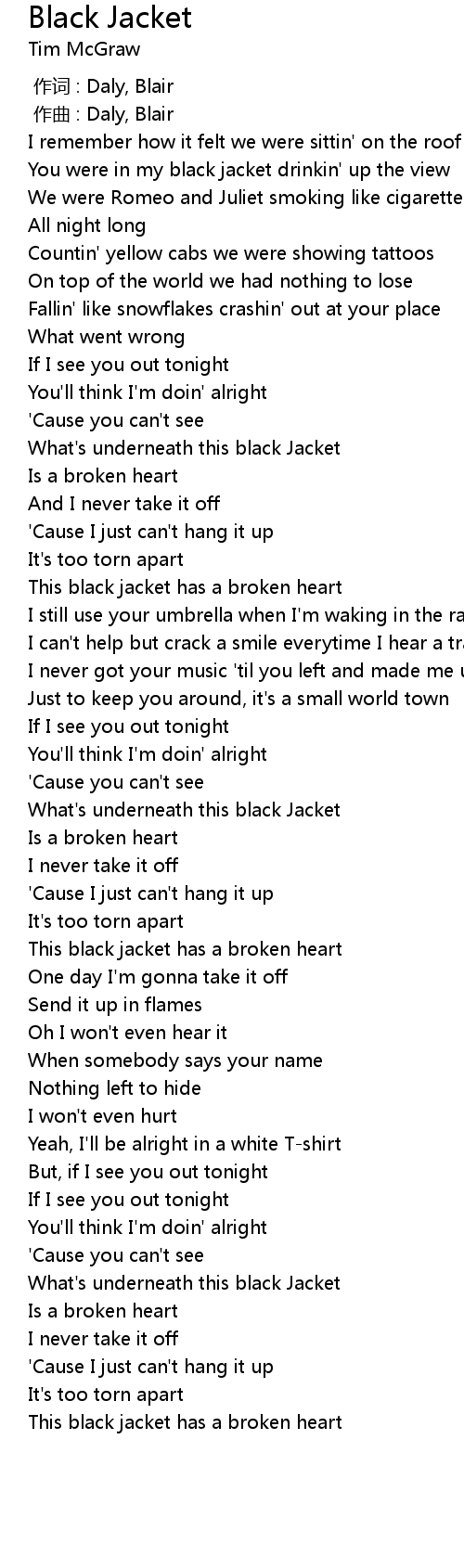 | [01:09.107] | This black jacket has a broken heart |