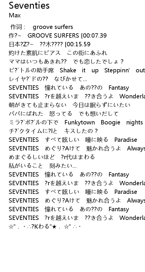 | [00:00.76]作?~ GROOVE SURFERS [00:07.39]作曲 GROOVE SURFERS [00:12.02]日本?Z?~ ??木???? [00:15.59]?h MAX [00:41.32]灼けた素肌にピアス この街にあふれ [00:48.07]ママはいつもあきれ?? でも恋したでしょ? [00:54.38]ビ?`トルの助手席 Shake it up Steppinn' out 笑ってた [01:00.72]レイヤ?`ドの?? なびかせて... [01:07.32]SEVENTIES 憧れている あの??の Fantasy [01:13.59]SEVENTIES ?rを越えいま ??き合うよ Wonderland [01:32.64]朝がきても止まらない 今日は眠らずにいたい [01:38.98]パパにばれた 怒ってる でも想いだして [01:45.35]ミラ?`ボ?`ルの下で Funkytown Boogie nights 踊ってた [01:51.73]チ?`クタイムに?lと キスしたの? [01:58.52]SEVENTIES すべて眩しい 瞳に映る Paradise [02:04.84]SEVENTIES めぐり?Aけて 魅かれ合うよ Always [02:10.90]めまぐるしいほど ?r代はまわる [02:17.22]私がいること 刻みたい... [02:36.87]SEVENTIES 憧れている あの??の Fantasy [02:43.20]SEVENTIES ?rを越えいま ??き合うよ Wonderland [02:49.66]SEVENTIES すべて眩しい 瞳に映る Paradise [02:56.01]SEVENTIES めぐり?Aけて 魅かれ合うよ Always [03:02.32]SEVENTIES 憧れている あの??の Fantasy [03:08.74]SEVENTIES ?rを越えいま ??き合うよ Wonderland [03:45.42] | ? K |
