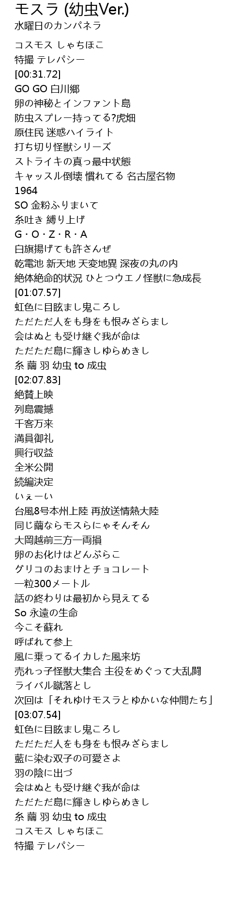 | [03:01.44] | 次回は「それゆけモスラとゆかいな仲間たち」 |