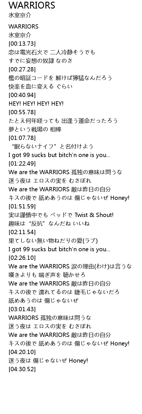 | [02:27.02] | We are the WARRIORS 涙の理由(わけ)は言うな |