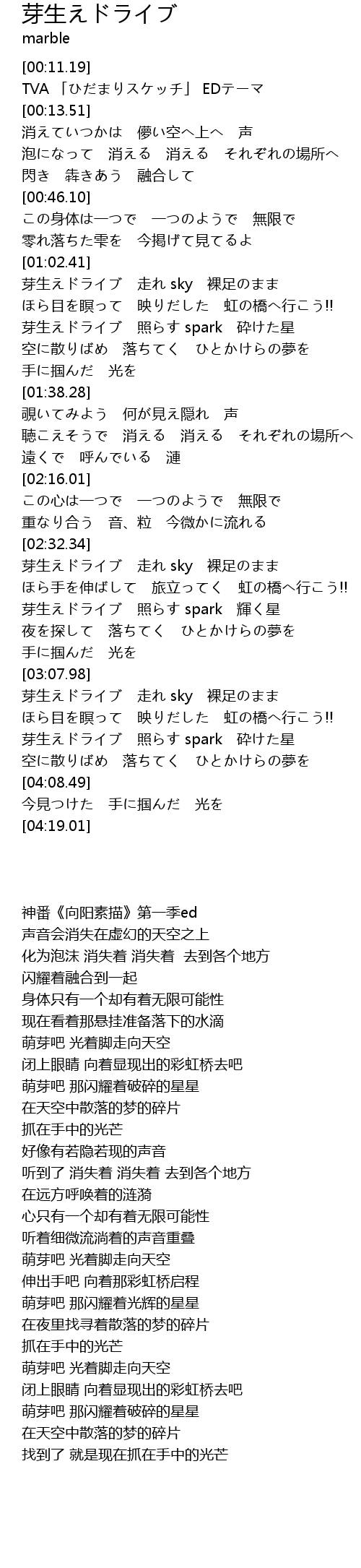 | [03:54.23] | 芽生えドライブ 照らす spark 砕けた星 |