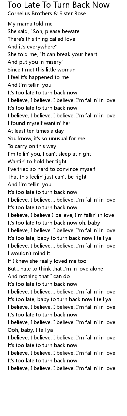 It's too late, baby to turn back now I tell ya |