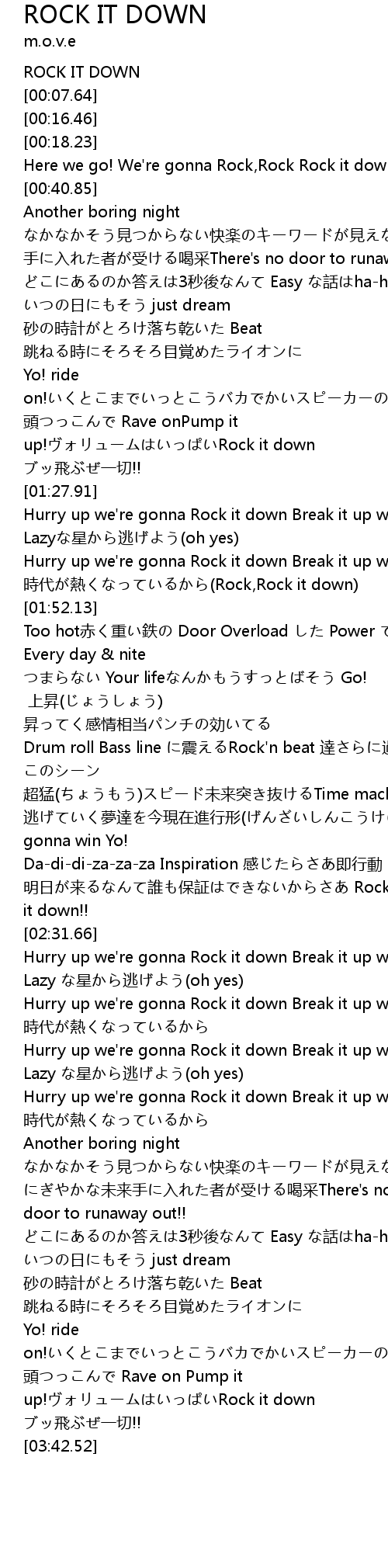 | [03:02.65] | Hurry up we're gonna Rock it down Break it up we just Rock it down |