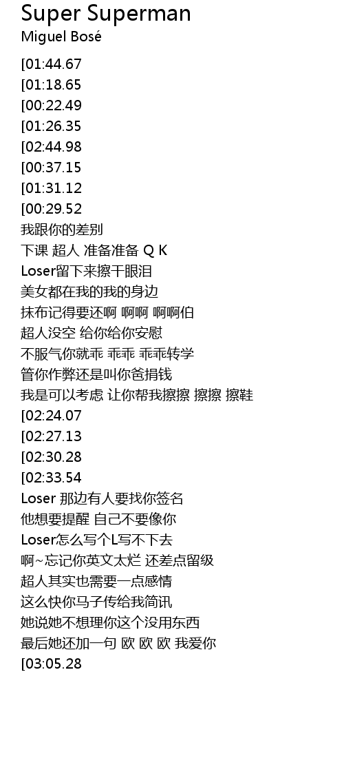 | [02:43.24][02:44.98][02:46.60][02:56.66][02:58.16][02:59.60] | year wo shi superman |