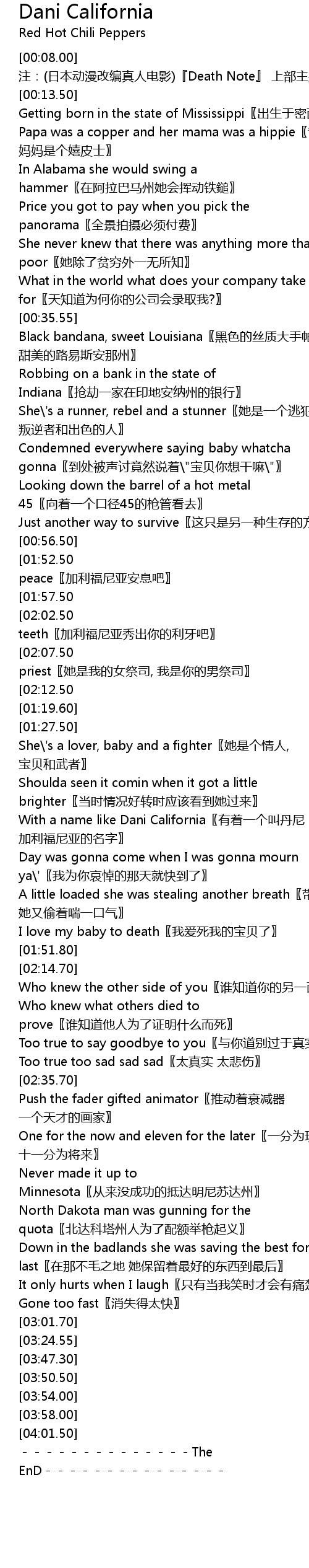 | [01:36.87] | With a name like Dani California you zhe yi ge jiao dan ni jia li fu ni ya de ming zi |