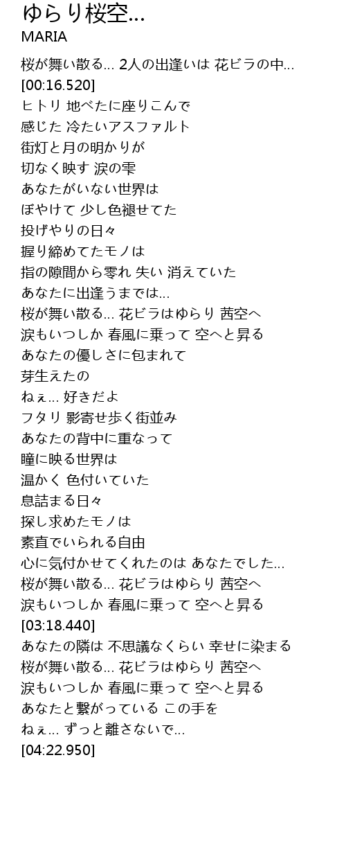 | [03:42.000] | 桜が舞い散る… 花ビラはゆらり 茜空へ |