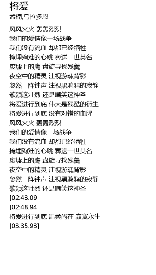 | [03:12.83][02:43.09][02:27.11] | 将爱进行到底 伟大是残酷的衍生 |