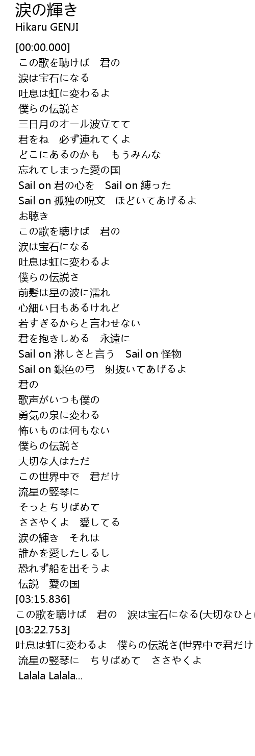 | [03:15.836] | この歌を聴けば 君の 涙は宝石になる(大切なひとはただ) |