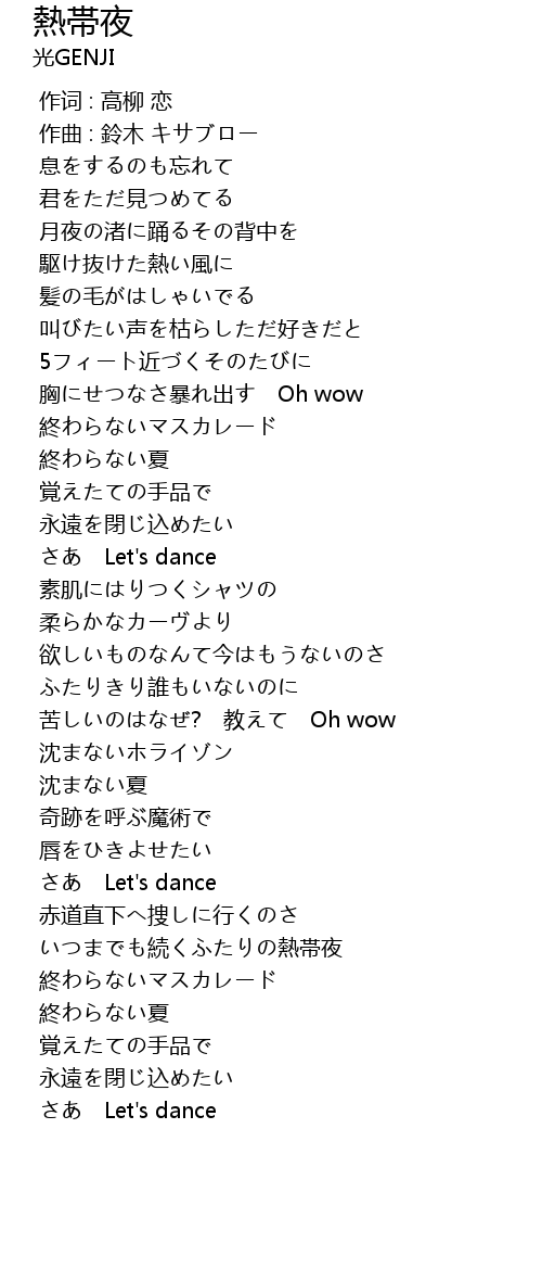 | [03:33.549] | いつまでも続くふたりの熱帯夜 |