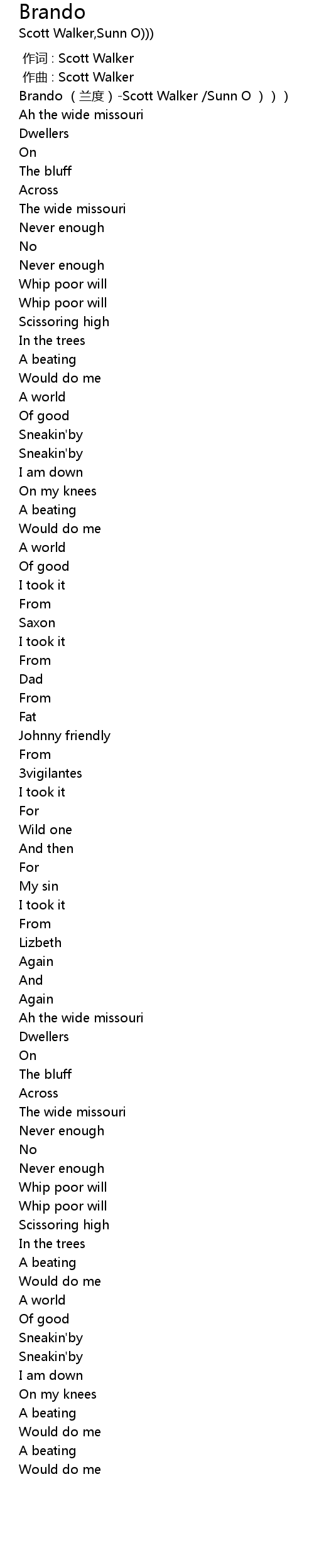 | [00:00.00] | Brando (兰度)-Scott Walker /Sunn O ))) |