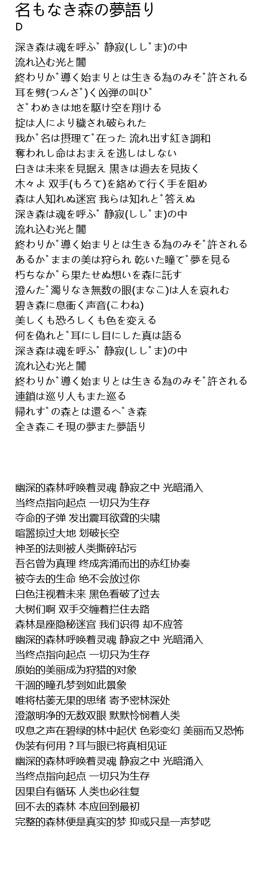 | [03:25.129] | 深き森は魂を呼ぶ 静寂(しじま)の中 流れ込む光と闇 |