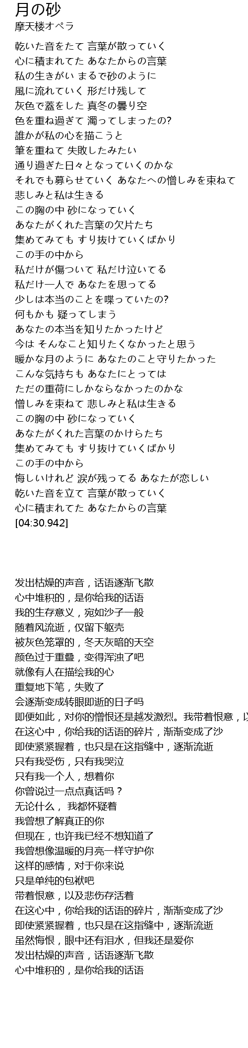 | [01:39.030] | この胸の中 砂になっていく あなたがくれた言葉の欠片たち |