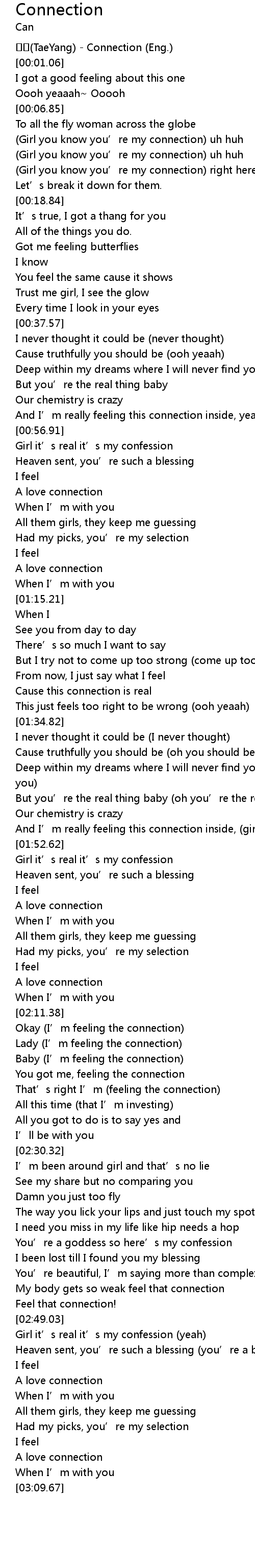 | [00:00.43] | 태양(TaeYang) - Connection (Eng.) |