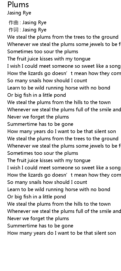 | [00:16.01] | We steal the plums from the trees to the ground |