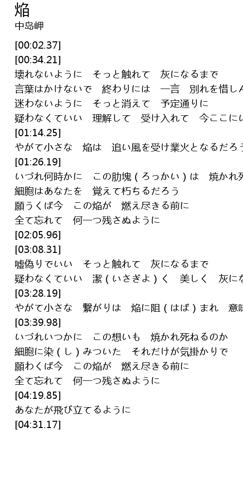 | [00:35.21] | 壊れないように そっと触れて 灰になるまで |