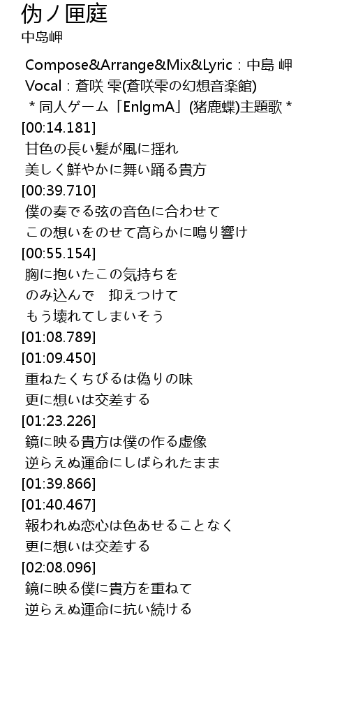 | [00:12.963] | *同人ゲーム「EnlgmA」(猪鹿蝶)主題歌* |