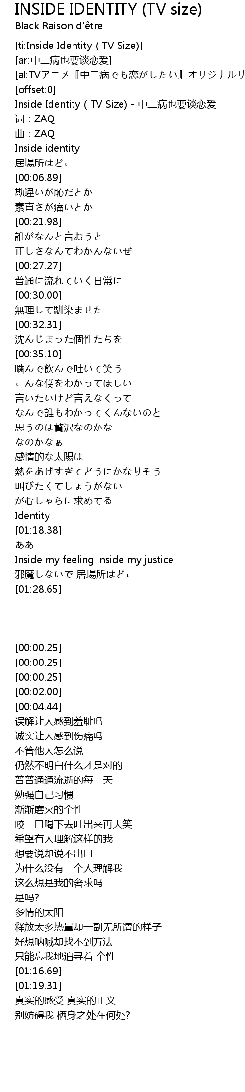 | [00:00.25] | Inside Identity TV Size zhōng èr bìng yě yào tán liàn ài |