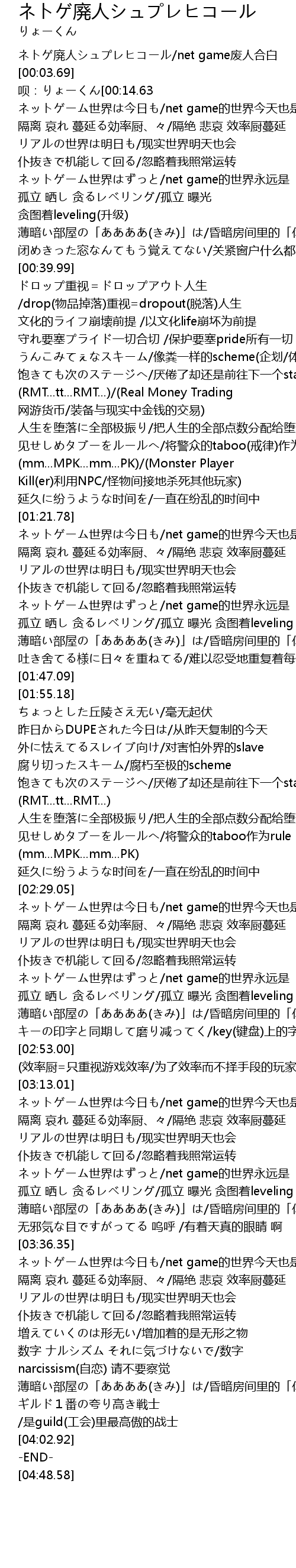| [00:01.12] | ネトゲ廃人シュプレヒコール/net game废人合白 |