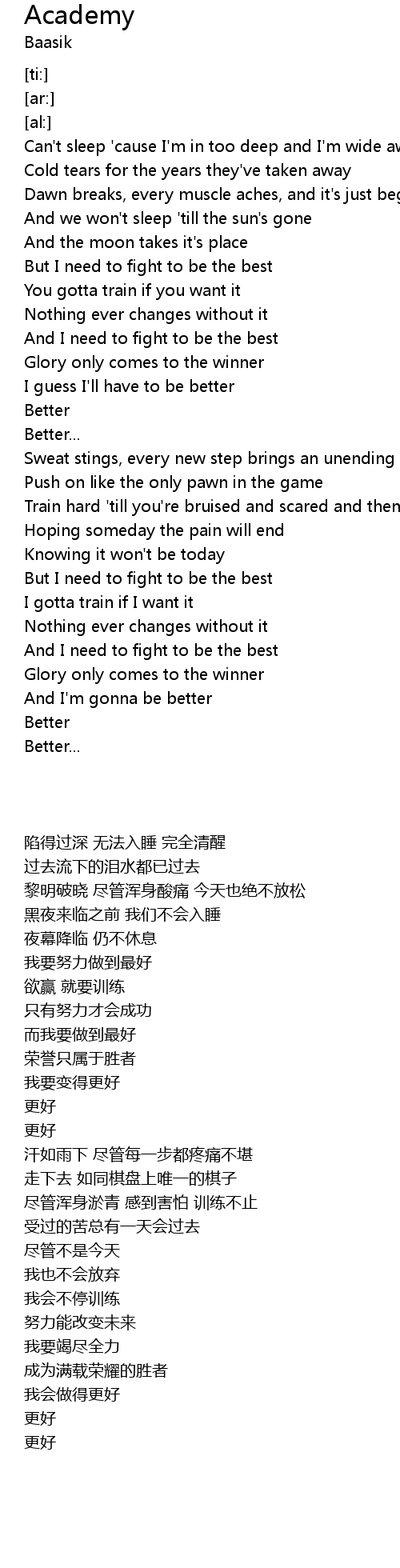 | [02:56.44] | Train hard 'till you're bruised and scared and then train again |