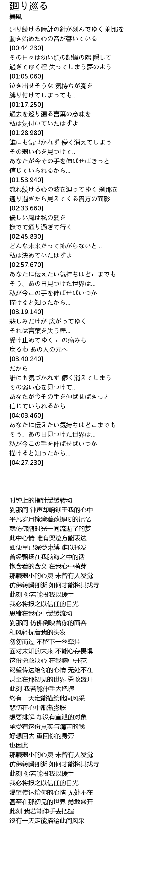 | [00:26.840] | 廻り続ける時計の針が刻んでゆく 刹那を |
