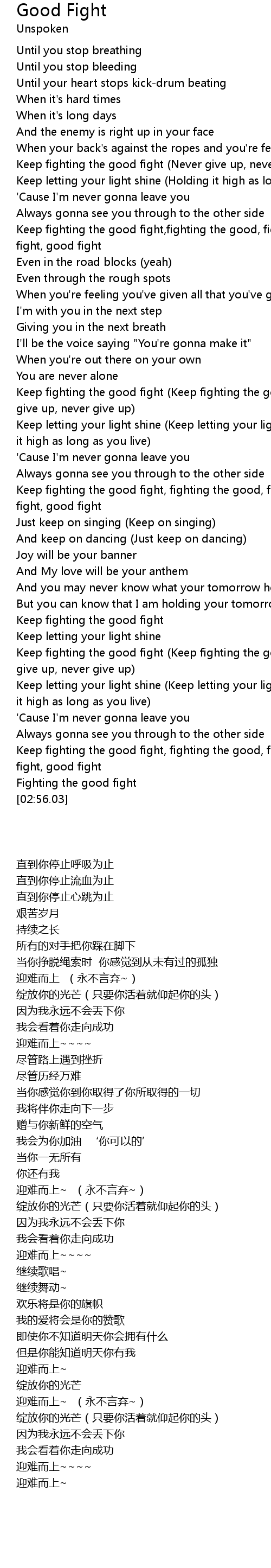 | [02:24.93] | Keep fighting the good fight, fighting the good, fighting the good fight, good fight |