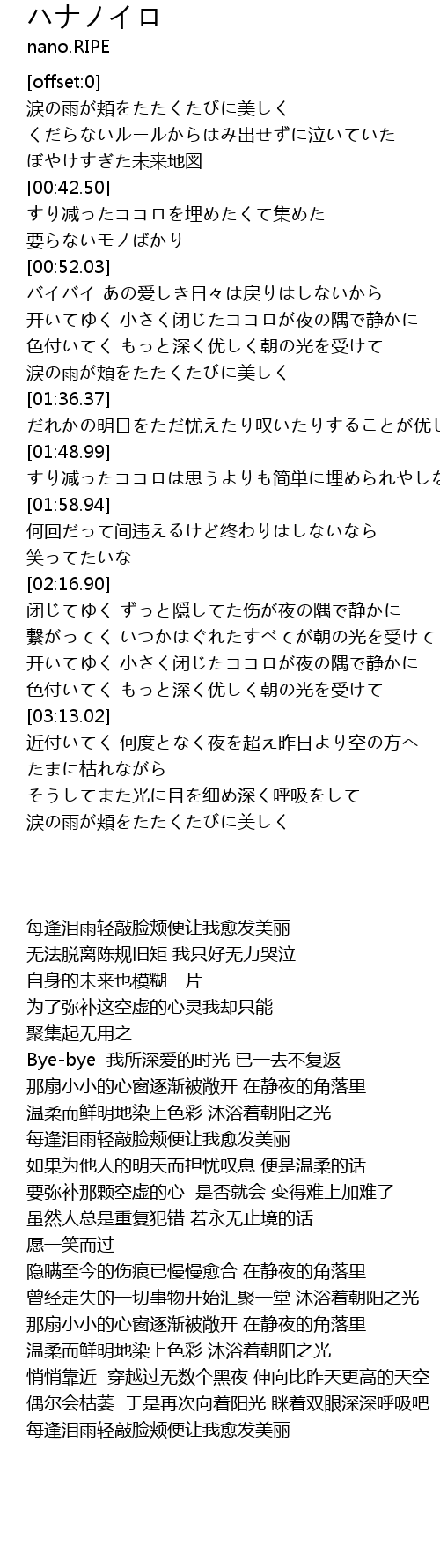 | [02:41.41] | 繋がってく いつかはぐれたすべてが朝の光を受けて |