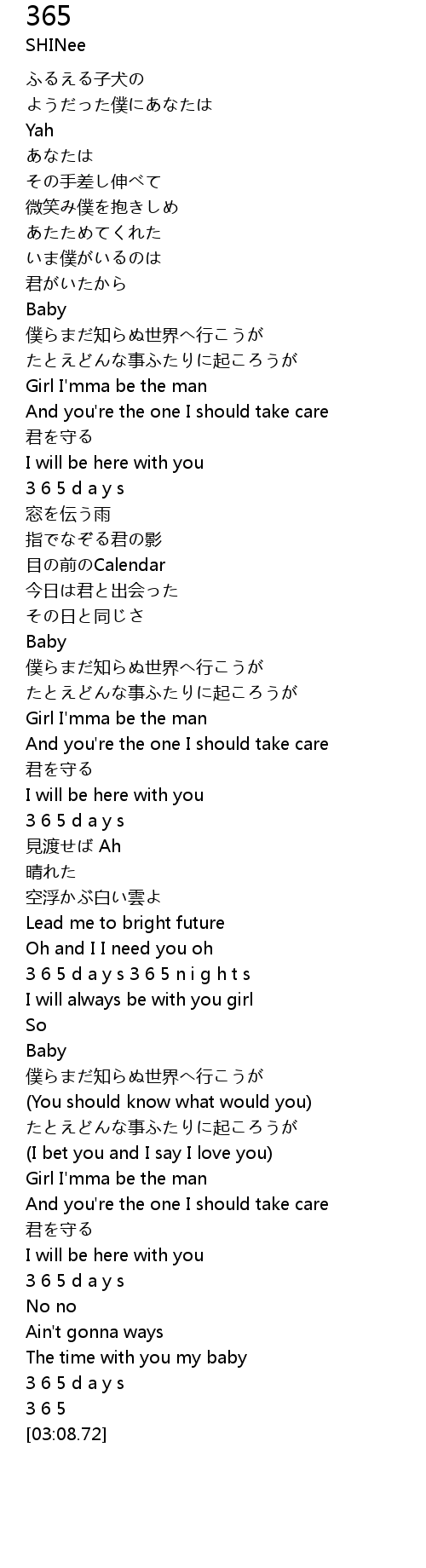 | [02:15.76] | 3 6 5 d a y s 3 6 5 n i g h t s |