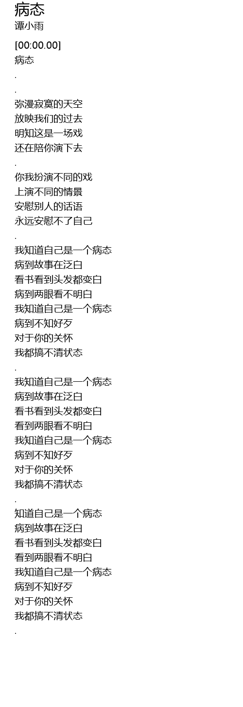 | [01:51.52] | wo zhi dao zi ji shi yi ge bing tai |