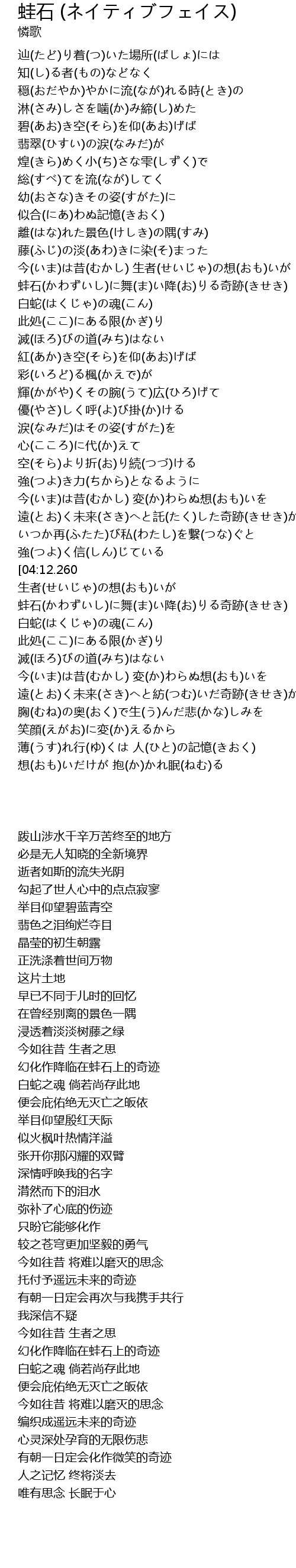 | [04:19.990] | 蛙石(かわずいし)に舞(ま)い降(お)りる奇跡(きせき) |