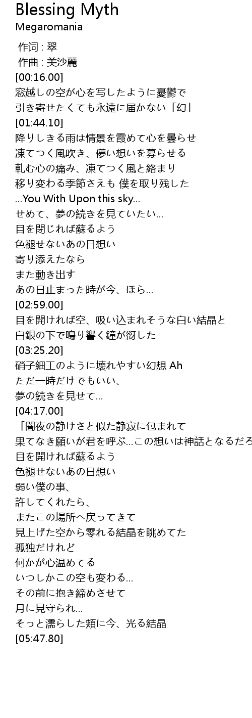 | [04:38.60] | 果てなき願いが君を呼ぶ...この想いは神話となるだろう」 |