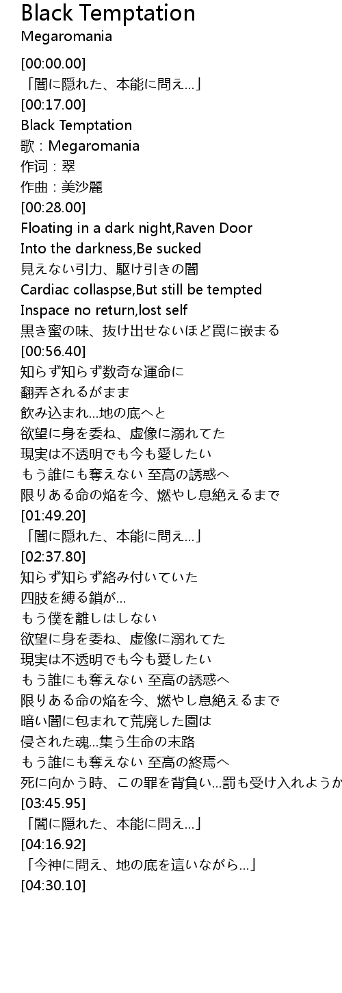 | [00:31.40] | Floating in a dark night, Raven Door |