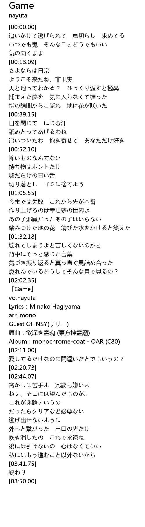 | [02:09.00] | 原曲:欲深き霊魂 (東方神霊廟) |