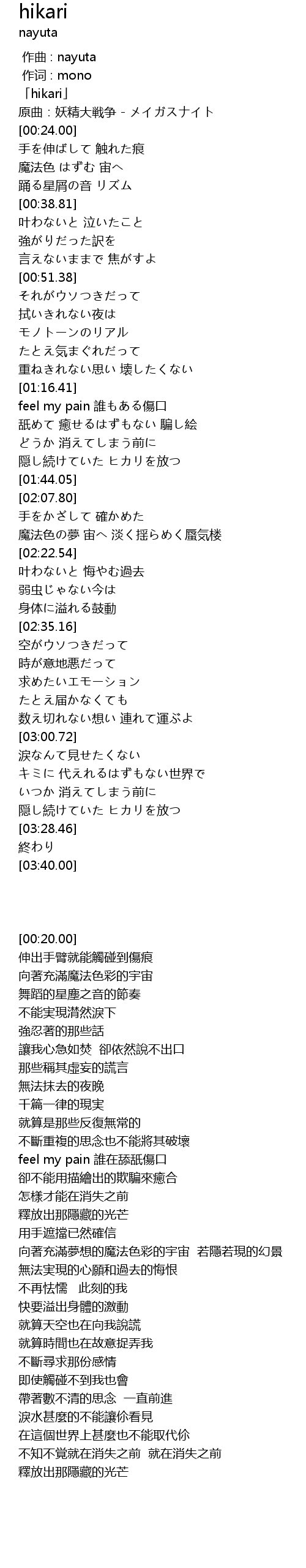 | [00:00.00] | 「hikari」 |