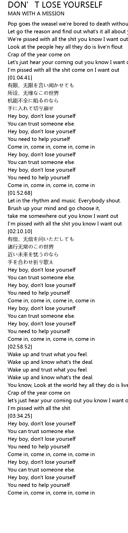 | [04:04.31] | Hey boy, don't lose yourself |