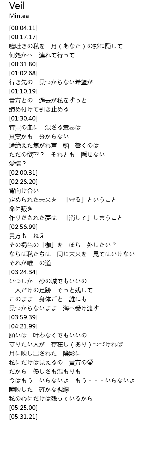 | [01:44.27] | 途絶えた焦がれ声 頭 響くのは |