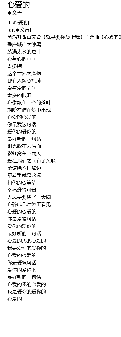 | [00:01.113] | 黄鸿升&卓文萱《就是要你愛上我》主題曲《心愛的》. |