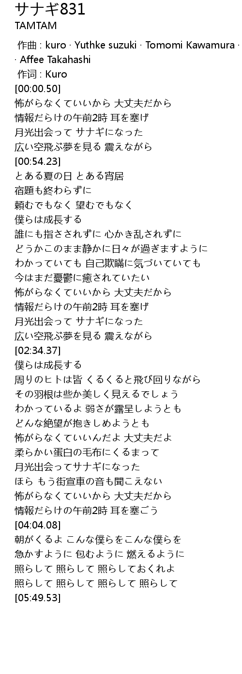| [00:00.00] | zuo qu : kuro Yuthke suzuki Tomomi Kawamura Junet Kobayashi Affee Takahashi |