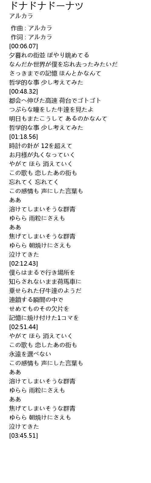 | [00:57.80] | 都会へ伸びた高速 荷台でゴトゴト |