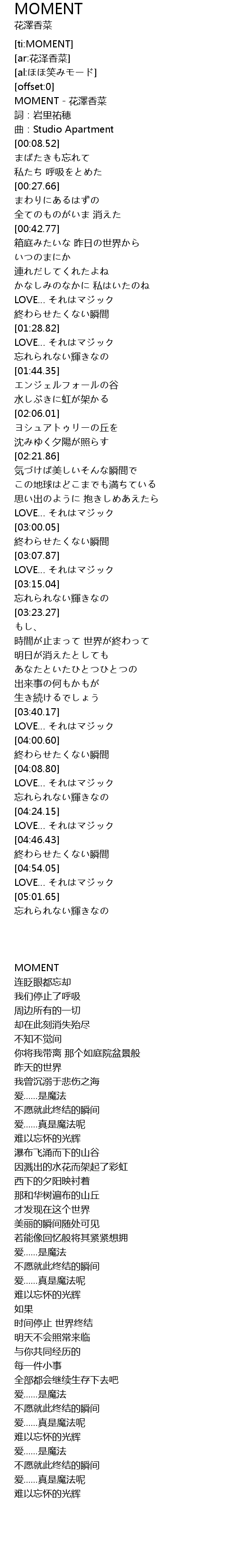 | [00:01.10] | MOMENT hua ze xiang cai |