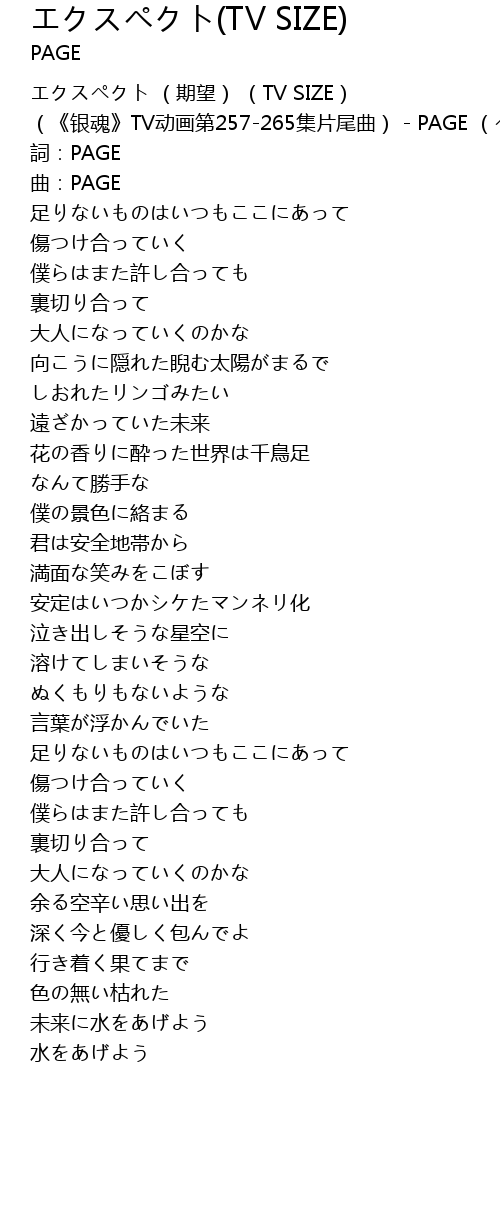 | [00:00.330] | エクスペクト (期望) (TV SIZE) (《银魂》TV动画第257-265集片尾曲) - PAGE (ペイジ) |