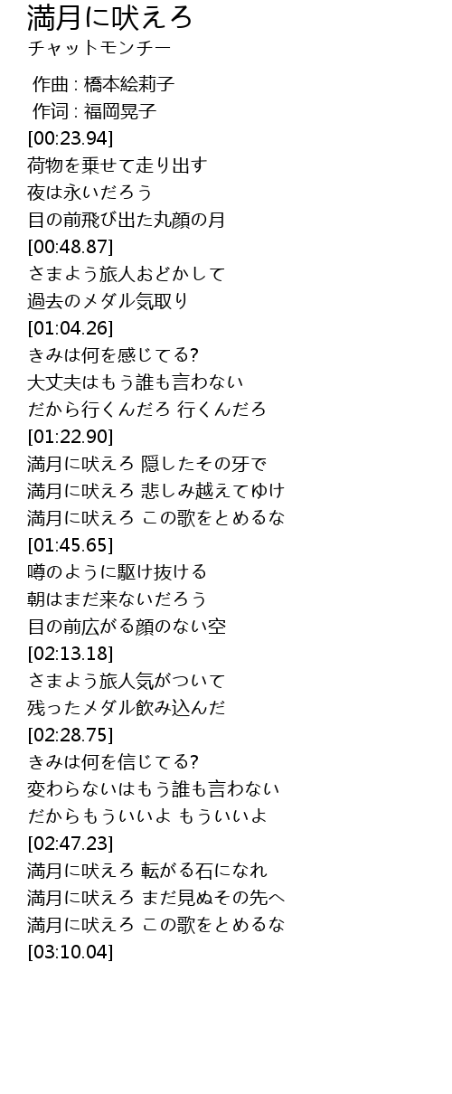 | [03:04.54] | 満月に吠えろ この歌をとめるな |