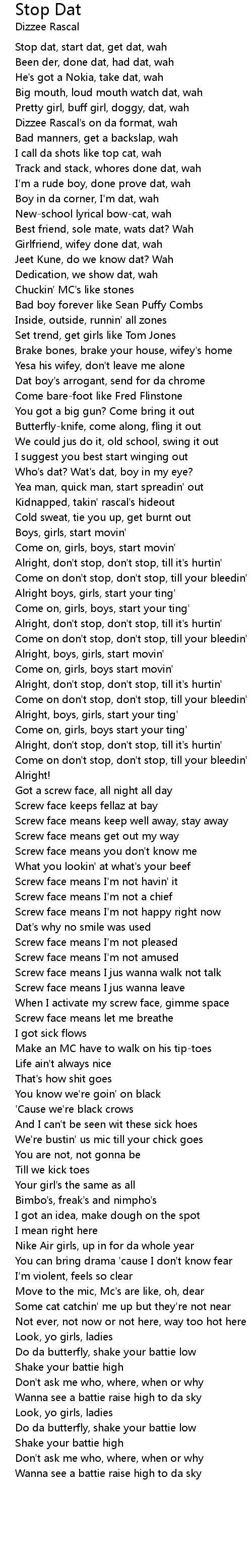 Stop dat, start dat, get dat, wah |