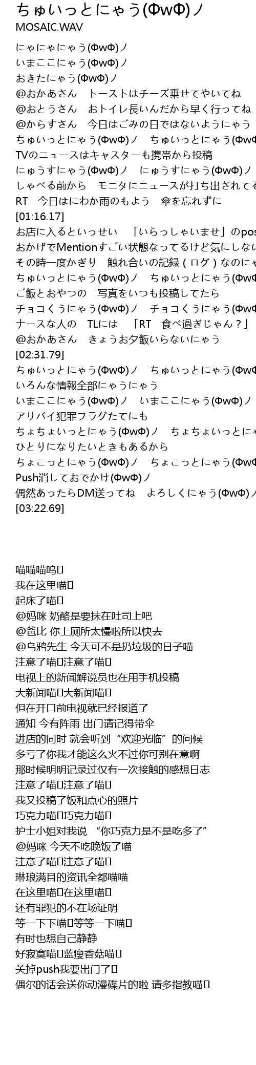 | [02:53.79] | ちゅいっとにゃう(ΦwΦ)ノ ちゅいっとにゃう(ΦwΦ)ノ |