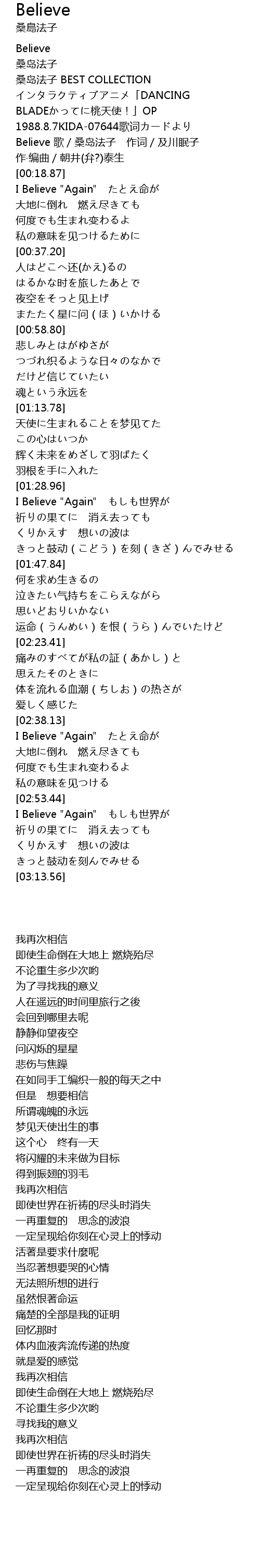 | [00:17.36] | Believe 歌/桑岛法子 作词/及川眠子 |