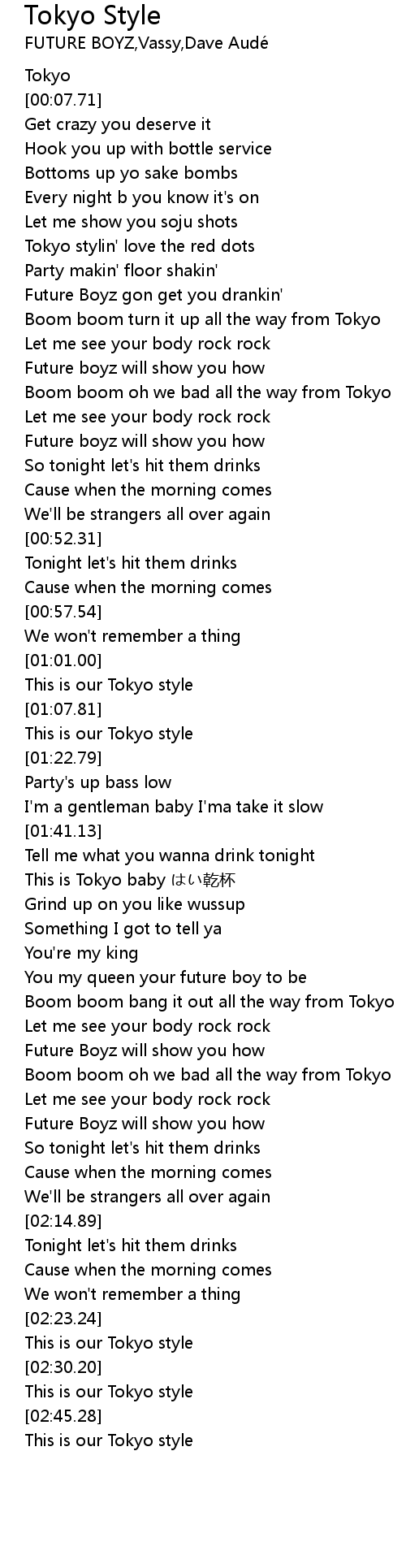 | [02:00.10] | Boom boom oh we bad all the way from Tokyo |