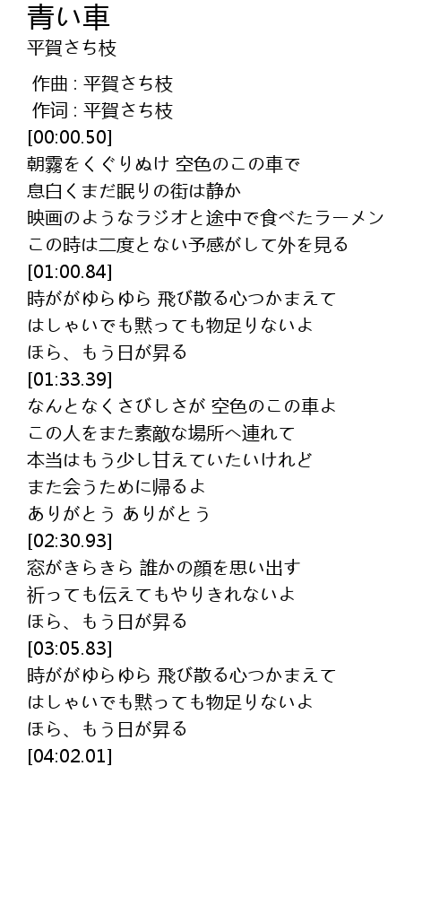 | [01:41.06] | なんとなくさびしさが 空色のこの車よ |