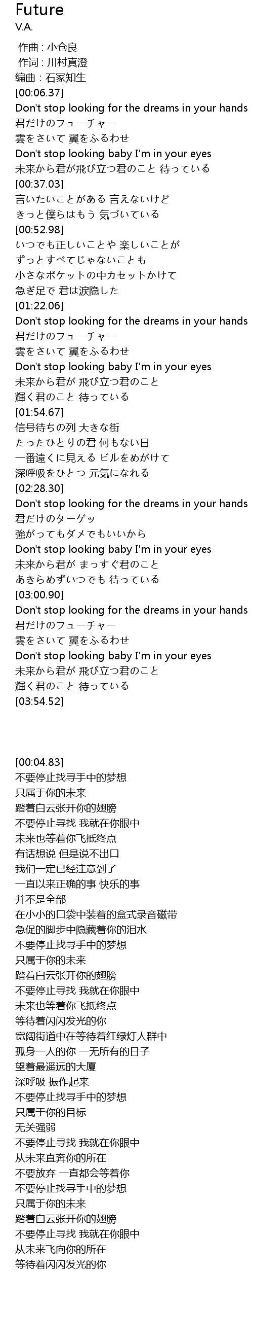 | [01:23.02] | Don't stop looking for the dreams in your hands |