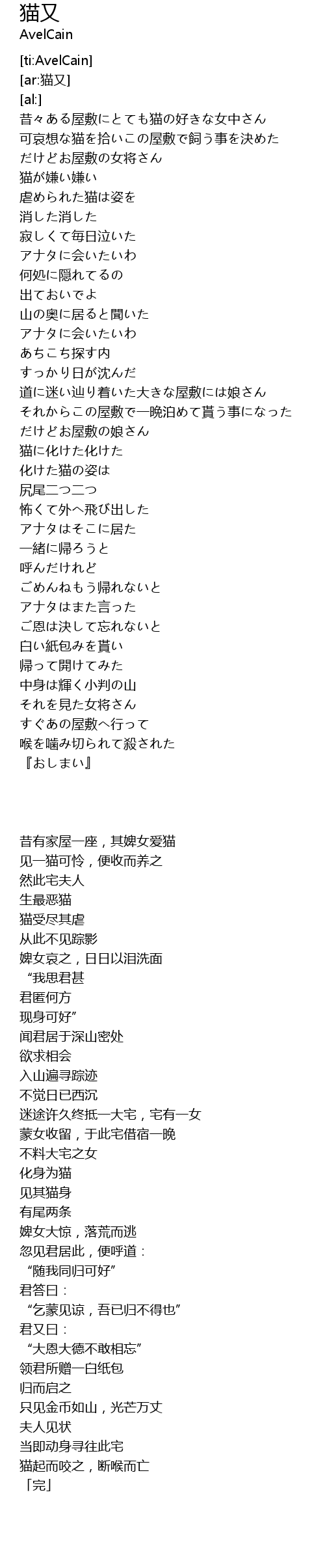 | [00:55.21] | 可哀想な猫を拾いこの屋敷で飼う事を決めた |
