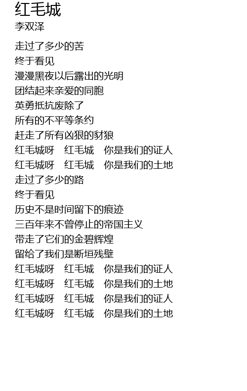 | [02:36.15] | hóng máo chéng ya hóng máo chéng nǐ shì wǒ men de tǔ dì |